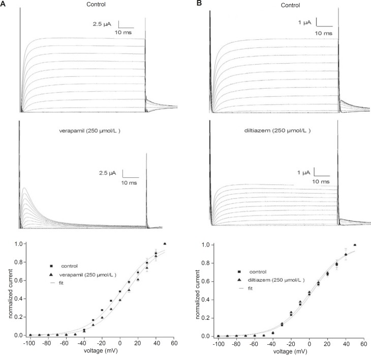 Figure 5. Effects of verapamil (A) and diltiazem (B) on the activation of the fKv1.4ΔN currents. Current traces were obtained by applying 80 ms pulses to potentials ranging from –100 to +50 mV and were followed by tail currents upon repolarization to –40 mV in the absence (upper panels) and in the presence of 250 μmol/L verapamil and 250 μmol/L diltiazem (middle panels). Bottom panels: steady-state activation relationships. The peak currents (measured at +50 mV) are plotted as a function of the holding potential. Continuous lines represent the fit of the data to a Boltzmann equation: f = 1/{1 + exp*[(V – V1/2)/k)]}, where V represents the test potential, V1/2 is the mid-point of activation, and k is the slope factor. Average data are shown as mean ± SEM (n = 5).