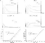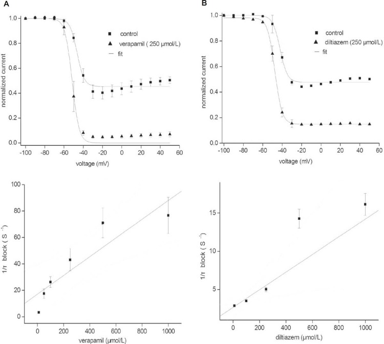 Figure 6. Changes in the inactivation kinetics of fKv1.4ΔN currents by verapamil (A) and diltiazem (B). Upper panels: Steady-state inactivation was studied using a two-pulse voltage protocol. Currents were measured at +50 mV, and the 5-sec pre-pulses to potential varied from –100 to +50 mV in steps of 10 mV. The curves for steady-state inactivation were fitted with the Boltzmann equation: f = 1/{1 + exp*[(V – V1/2)/k)]}. Where V represents the test potential, V1/2 is the mid-point of inactivation, and k is the slope factor. Lower panels: time constant of inhibition as a function of the drug concentration. Time constants (τblock) were estimated from a single or double exponential fits to the tracings shown in Figure 2. The apparent rate constants for association (k+1) and dissociation (k–1) were obtained from the equation: 1/τblock = k+1[d] + k–1. Data are shown as mean ± SEM (n = 5).