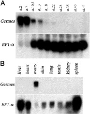 Fig. 2. Molecular analysis of Germes expression. (A) Northern blot analysis of Germes RNA expression during embryogenesis. (B) Northern hybridization of Germes with RNA from adult tissues. The stages or tissues tested are indicated at the top of each line. Membranes were first hybridized with the Germes probe, then stripped and reprobed with EF-1α probe as a loading control.