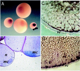 Fig. 3. Localization of Germes mRNA during oogenesis analyzed by in situ hybridization. (A) Whole-mount of stages IâVI oocytes, vegetal view. In the smallest oocytes (stage II), the entire cytoplasm is heavily stained. (B) Epon section through stage II oocytes reveals concentration of Germes message in mitochondrial cloud. Oocyte on the right illustrates the commencement of the accumulation of the message in the vegetal cortex. (C) In situ hybridization for Germes on paraffin sections of stage III oocyte. The mRNA anchors on the vegetal cortex, forming the continuous layer. (D) In situ hybridization on paraffin sections of stage VI oocytes. The Germes transcript forms a granular pattern within the vegetal cortex. mc, mitochondrial cloud; n, nucleus; vc, vegetal cortex.