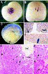 Fig. 4. Analysis of localization of Germes mRNA during early Xenopus development by in situ hybridization. (A,B) Whole-mount hybridization of two- (A) and eight-cell (B) stage embryo, vegetal view. Germes RNA localizes within small individual granules at the vegetal pole of two-cell stage embryo (A). These granules appear to aggregate into lager complexes in the vegetal cortex of eight-cell embryo (B). (C) Transparent Epon block of early blastula, containing half of the embryo and viewed from above. Small Germes RNA-staining islands have coalesced into a few aggregates, settling inside the vegetal cells. (D,E) Epon sections of eight-cell (D) and early blastula (E) (same embryo as in (C)) stages. Aggregating granules have lost their connection with the vegetal cortex and change their position inside the cells. (F) Epon section of mid-gastrula stage. There is a Germes RNA-positive PGC in endoderm mass. Higher magnification of the same slide (G) shows perinuclear localization of the transcript. Compare yolk-free stained perinuclear region of PGC (G) with yolk-reach cytoplasm of endodermal cells (H). bcl, blastocoel; gcl, gastrocoel; nuclei are marked by arrows. The border of PGC, discernible at higher resolution, is marked by arrowheads.