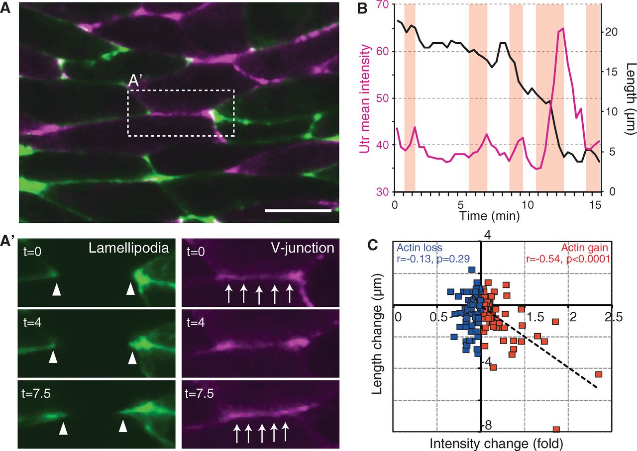 (A) Mosaic expression of two colors of the actin biosensors utrophin-FP. (A′) Time-lapse after the junction in box A′. Two populations of actin are visible: bipolar lamellipodia (green, arrowheads) and actin at the v-junction (magenta, arrows). (B) Mean intensity of utrophin (Utr, pink line) at v-junctions during edge length shortening (black line). (C) Edge length change is correlated with increase of utrophin intensity (red) but not with reduction in utrophin intensity (blue) (n = 133 cycles; six explants).