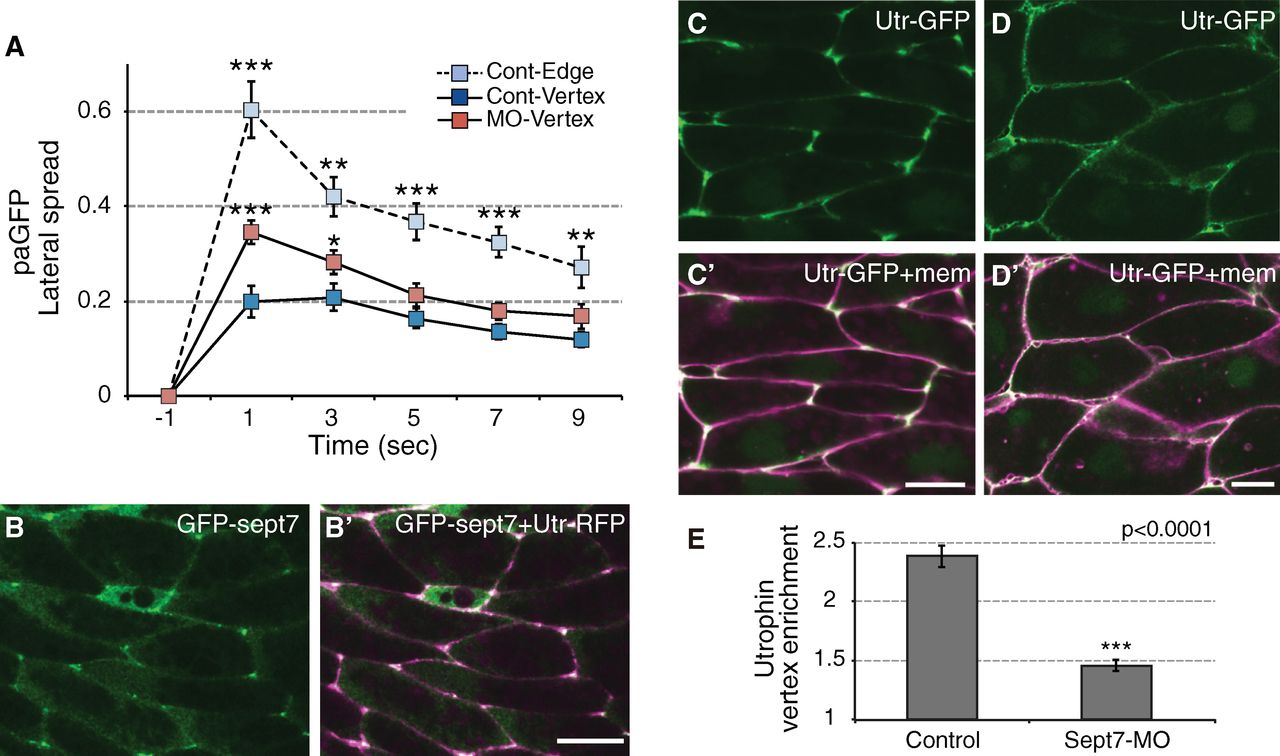 (A) Quantification of the lateral spread of paGFP-Utr at a cell vertex or edge (fig. S10A) (*P < 0.05, **P < 0.001, ***P < 0.0001, n = 7 to 11 explants). (B) GFP-sept7 localization in explant. (B′) GFP-sept7 colocalizes with Utr–red fluorescent protein (RFP) at vertices. (C and C′) Utr-GFP normally localizes at vertices. (D and D′) Sept7 knockdown disrupts utrophin accumulation at the vertices. (E) Quantification of (C) and (D) (see also fig. S7B). Scale bar, 20 μm; error bars, SE.