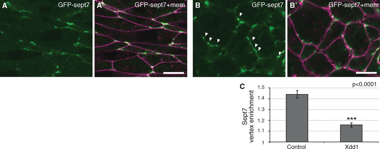 (A and A′) GFP-Sept7 localizes at vertices in control explants. (B and B′) Dominant negative dishevelled (Xdd1) promotes ectopic GFP-Sept7 localization along edges (arrowheads). (C) Quantification of GFP-Sept7 localization (control, n = 67 and six explants; Sept7-MO, n = 50 and six explants; scale bar, 20 μm) (see also fig. S7B).
