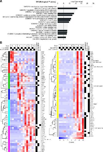 Figure 1. Sox17-dependent genes in differentiating ESCs.(A): The top 20 GO biological process terms that were dysregulated in Sox17-deficient mouse ESCs. Those specific for cardiovascular development and function are highlighted (black), and a p-value of 1E-5 is noted for reference (Supporting Information Figs. S1, S2). (B): Heat map of gene expression levels for 126 Sox17-regulated genes from a curated gene set related to cardiac myogenesis (Supporting Information Table S2). Genes that fulfill the filtering criteria in Supporting Information Figure S1A are presented, grouped according to the temporal clusters obtained from the whole-transcriptome analysis (Supporting Information Fig. S1D). Functional annotations are shown at the right for transcription factors, extracellular/membrane proteins, and muscle-specific genes for cardiac contractility. For the complete set of affected genes refer Supporting Information Figure S3. Sox17, Hhex, and Cer1 are highlighted. Abbreviation: GO, gene ontology.