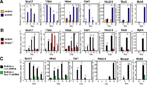 Figure 4. Sox17 mediates the Activin/Nodal pathway for cardiac myogenesis. (A): Induction of Sox17, Hhex, Cer1, and cardiac genes in Activin-treated embryonic stem cells (ESCs). (B): The Nodal receptor Cripto is essential for induction of the endoderm-associated Sox17-Hhex-Cer1 pathway. (C): Sox17 shRNA recapitulates the Cripto-deficient phenotype in Activin-treated ESCs. Cells were grown in monolayer culture for panels (A) and (C), and as embryoid bodies for panel (B). *, p < .05 versus control cells; n ≥ 3.