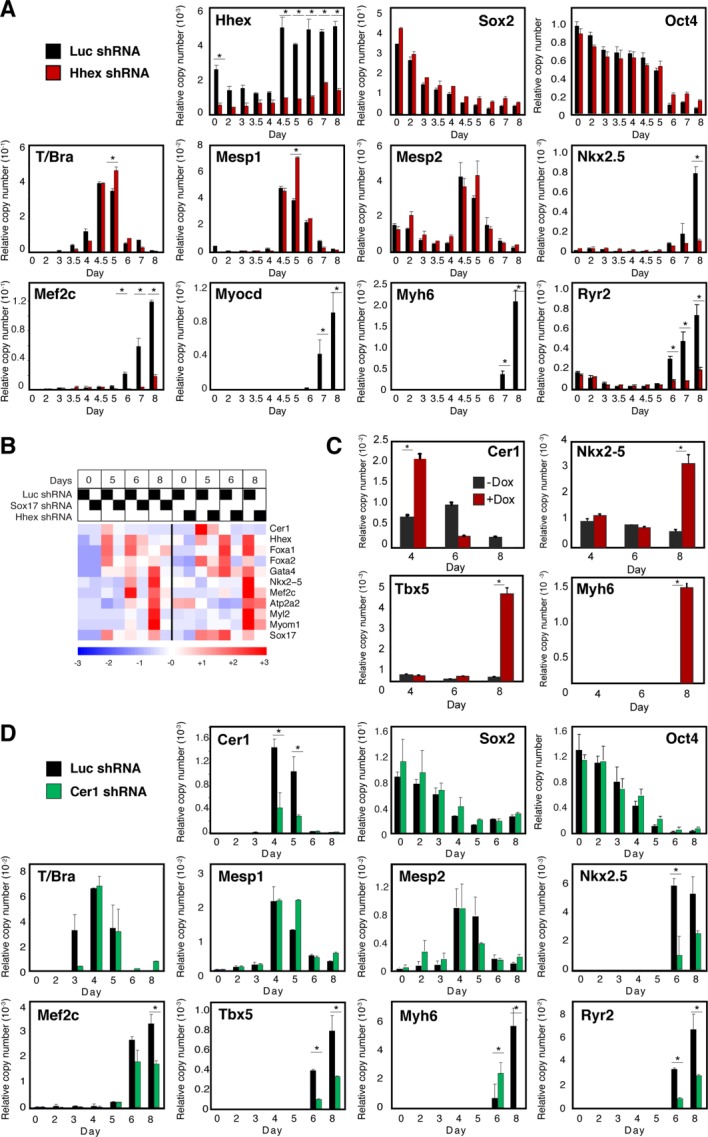 Figure 3. The Sox17-dependent genes Hhex and Cer1 are important for cardiac myogenesis in differentiating ESCs. (A–C): Hhex and (D) Cer1 shRNA suppressed the respective cognate genes in differentiating ESCs and inhibited the induction of cardiac transcription factors and structural genes, acting at a stage subsequent to induction of Mesp1/2. *, p < .05 versus control cells; n ≥ 3. (A, D): Results are shown for the most potent of the shRNAs tested, measured by effectiveness against the endogenous transcripts. For each gene, qualitatively similar results were obtained using at least two independent shRNAs. (B): Partial comparison of the microarray findings with Hhex and Sox17 shRNAs, illustrating the shared impairment of Cer1, cardiac transcription factors, and cardiac structural genes. In addition, a potential positive feedback loop between Hhex and Sox17 is noted. n = 2 for Hhex shRNA; n = 1 for the Luc shRNA controls. (C): Ectopic Cer1 expression rescues cardiac differentiation in Hhex-knock down ESCs. Cer1 was encoded by a tetO-regulated lentiviral vector, and was induced on day 3 by doxycycline. Gene expression was assayed by QRT-PCR. *, p < .05 versus control cells; n ≥ 3.