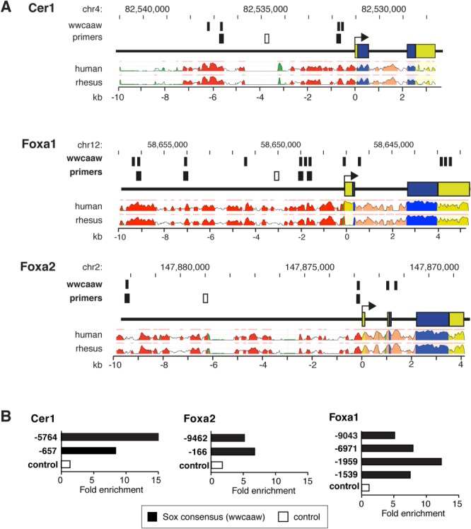 Figure 5. Sox17 binds to evolutionarily conserved Sox sites in the Cer1 upstream region. (A): Predicted Sox17 binding sites in the Cer1, Foxa1, and Foxa2 loci. Primers corresponding to predicted binding sites versus irrelevant control regions are indicated in black and white, respectively. Conservation profiles are shown for the human and rhesus orthologs (range, 50%–100%). Pink bars above the profiles denote regions of conservation with the mouse genome; blue, coding exons; yellow, untranslated regions; salmon, introns; red, intergenic regions; green, transposons and simple repeats. (B): Chromatin immunoprecipitation, assayed by quantitative PCR, shown as the fold enrichment for the indicated regions (V5 antibody, normalized for nonspecific precipitation by nonimmune IgG). Black, predicted Sox binding sites; white, irrelevant regions. For Foxa1 and Foxa2 refer Figure 6A.