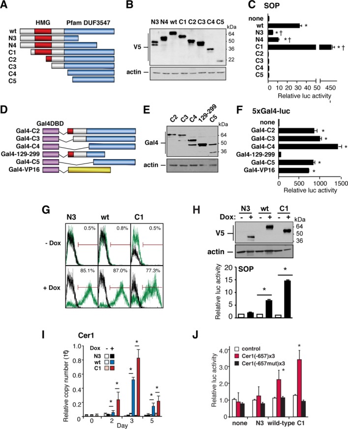 Figure 6. Sox17 activates Cer1. (A–F): Mapping the Sox17 transactivation domain. (A) Schematic representation of the Sox17 deletion mutants. Domain of unknown function 3547 (Pfam 24.0) designates the conserved C-terminal region of F group Sox proteins. (B): Western blot analysis of the constructs in 293T cells. (C): Sox-dependent reporter gene activity (SOP-FLASH) in 293T cells, in the presence of cotransfected Sox17 expression vectors. Deletion of the N terminus (C1) increases the transcriptional activity. Deletions of the conserved C-terminal domain (N3, N4) attenuate transactivation. (D): Schematic representation of the GAL4DBD-Sox17 fusion proteins. (E): Western blot analysis of the constructs in 293T cells, using antibody to Gal4. (F): Reporter gene activity (5xGal4-luc) in 293T cells, induced by GAL4-Sox17 vectors. Deletion of the Sox17 C-terminal domain (GAL4 129–299) cripples transactivation. Other constructs showed activity equal to or greater than that of GAL4-VP16. (G, H): Doxycycline-dependence of the Sox17 vectors, measured in AB2.2 cells by flow cytometry (G), Western blotting (H, above), and transactivation of SOP (H, below). (I): Wild-type Sox17 and the C1 truncation both induce endogenous Cer1. n ≥ 3; *, p < .05 versus control embryonic stem cells. (J): The multimerized Sox17 site at −657 of the Cer1 locus mediates Dox-dependent, sequence-specific trans-activation. n = 6; *, p < .01 versus the absence of Dox.