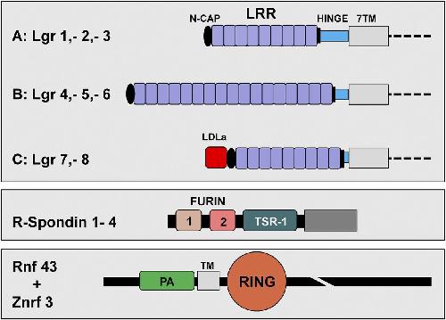 Figure 3. Schematic representation of the domain composition of Lgr1â8, R-spondin1â4, and Rnf43/Znrf3. The eight members of the Lgr family of GPCRs are characterized by the presence of a large ECD composed of LRRs. This domain is flanked by N-terminal and C-terminal caps and a C-terminal Hinge region connecting the LRR domain with the 7TM. They can be further subdivided into classes A, B, and C. The class A receptor family comprises Lgr1, Lgr2, and Lgr3, which are receptors for the glycoprotein hormones follicle-stimulating hormone, luteinizing hormone, and thyroid-stimulating hormone, respectively. Individual human A-type receptors contain nine LRRs and a relatively long Hinge domain. The class B receptor family consists of Lgr4, Lgr5, and Lgr6. The ECD consists of 17 LRRs, and their Hinge domain is of intermediate length. Lgr7 and Lgr8 constitute the class C receptor family. Both bind insulin-like peptide hormones. They exhibit a very short Hinge domain. They are distinguished by the presence of an LDLa N-terminal domain that is essential for signaling. R-spondin proteins harbor two Furin repeats, both required for Wnt signal enhancement. The Furin-1 domain interacts with RNF43/ZNRF3, while the Furin-2 domain binds Lgr4â6. The TSR-1 domain binds Syndecan-type cell surface receptors. RNF43 and ZNRF3 are homologous RING-type E3 ligases and are structurally related to Grail. Typically, these single-pass transmembrane proteins have an extracellular PA domain and a cytoplasmic RING domain. The E3 ubiquitin ligase activity exerted by the RING domains of Rnf43 and Znrf3 targets lysine residues in the 7TM loops of Frizzled receptors. Substrate recognition may be dependent on an interaction of their associated PA domain with the FrizzledâLRP5/6 Wnt receptor complex. |