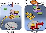 Figure 5. Regulation of Wnt receptor availability on stem cells. (Panels represent stills from animation that can be found at http://www.nymus3d.nl/video/rspondin.) (A) Upon binding of Wnt to the Fz/LRP receptor complex, some 100 Wnt target genes are activated, including Lgr5. Two other Wnt target genes, Rnf43 and Znrf3, encode transmembrane E3 ligases containing a cytoplasmic RING domain. These serve as components of a negative feedback loop. (B) Enzymatic interaction of the Rnf43/Znrf3-associated RING domain with the Fz/LRP complex leads to polyubiquitination of the intracellular loops of the 7TM domain of Fz. (C) The resulting endocytosis of Fz/Lrp abrogates Wnt signaling. The contribution of the PA domain in the specificity of this process is unclear. Whether Rnf43/Znrf3 are endocytosed with the Wnt receptor complex or segregate after their action is also unknown. When R-spondin is present (D), it is recruited to Lgr5 or its homolog, Lgr4 (E). This high-affinity interaction involves the Furin-2 repeat (Fu2) of R-spondin. This then enables the Furin-1 repeat (Fu1) of R-spondin to interact with Rnf43/Znrf3 (E), resulting in the membrane clearance of the latter (F). As a consequence, Wnt/Fz/Lrp receptor complexes persist on the plasma membrane, enhancing Wnt signal strength and duration. |