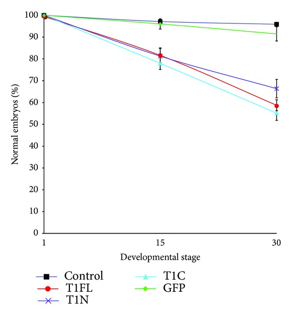Figure 4. Overexpression of all three TIMP-1 constructs leads to abnormal development and death. Following injection of mRNA constructs at the 1-cell stage, embryos were scored for a normal phenotype at stages 15 and 30. Dead and abnormal embryos were counted as containing morphological defects. The graph illustrates the percentage of normal embryos following injection of GFP mRNA (GFP), or full-length (T1FL), N-terminal (T1N), or C-terminal (T1C) TIMP-1 mRNA constructs at the given stage. Control embryos are uninjected. Results are based on 3 independent sets of experiments; bars indicate standard error.