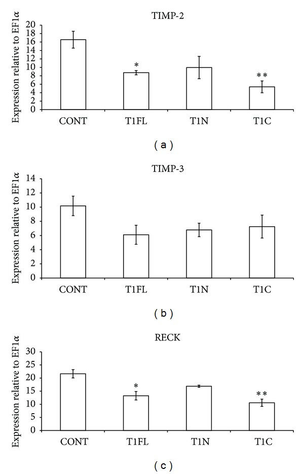 Figure 5. Effect of overexpression of full-length, N-terminal, or C-terminal TIMP-1 on mRNA levels of MMP inhibitors. Semiquantitative RT-PCR analysis was used to measure changes in mRNA levels of (a) TIMP-2, (b) TIMP-3, and (c) RECK at stage 30, following microinjection of 4âng of TIMP-1 full-length (T1FL), N-terminal (T1N), or C-terminal (T1C) constructs into X. laevis embryos at the 1-cell stage. In each case mRNA levels were measured relative to Ef1α. The results are presented as mean ± standard error from 3 independent experiments. *P < 0.05 and **P < 0.01, all versus control (CONT; uninjected) embryos, as analyzed by one-way ANOVA and Dunnett's post hoc test.