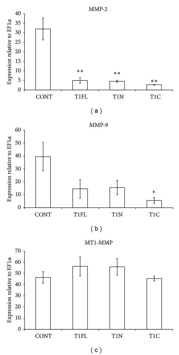 Figure 6. Effect of overexpression of full-length, N-terminal, or C-terminal TIMP-1 on mRNA levels of MMPs. Semiquantitative RT-PCR analysis was used to measure changes in mRNA levels of (a) MMP-2, (b) MMP-9, and (c) MT1-MMP at stage 30, following microinjection of 4âng of TIMP-1 full-length (T1FL), N-terminal (T1N), or C-terminal (T1C) constructs into X. laevis embryos at the 1-cell stage. In each case mRNA levels were measured relative to Ef1α. The results are presented as mean ± standard error from 3 independent experiments. *P < 0.05 and **P < 0.01, all versus control (CONT; uninjected) embryos, as analyzed by one-way ANOVA and Dunnett's post hoc test.