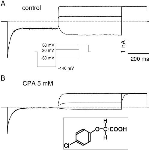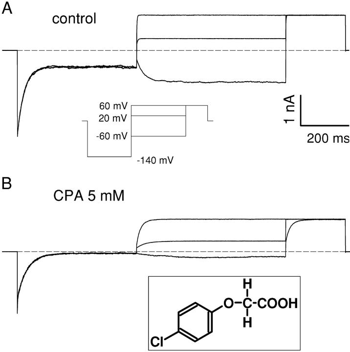 Figure 1. . Effect of intracellular CPA on macroscopic currents of the CLC-0 mutant C212S. (A) Currents recorded from an inside out patch in control conditions with a pulse protocol in which, after a 400-ms pulse to −140 mV, to maximally deactivate the channels, the voltage was varied between Vp = −140 and +60 mV, followed by a constant tail pulse to +60 mV. Only the traces for Vp = +60, +20, and −60 are shown. The inset shows a schematic representation of the pulse protocol. (B) Currents recorded from the same patch in the presence of 5 mM CPA in the intracellular solution. The inset shows the chemical structure of CPA. Scale bars in A apply also to B.
