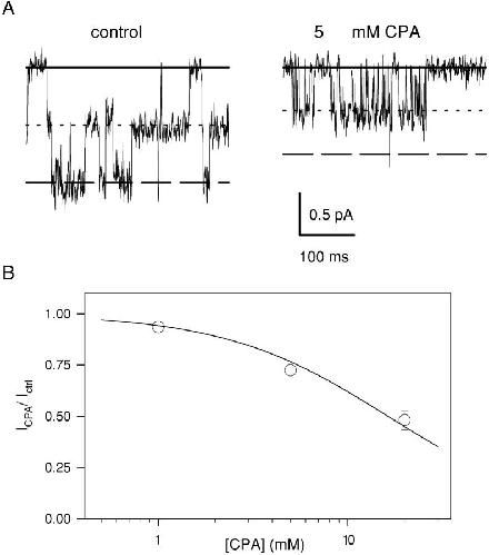 Figure 6. . Fast open channel block by CPA. (A) The fast open channel block is illustrated at an expanded time scale. Short stretches of a single-channel recording without (left) and with 5 mM CPA in the intracellular solution (right) at −100 mV are shown (digitally filtered at 1 kHz). The solid line represents the zero current level, the dotted line represents the current level associated to one pore open, and the dashed line represents the current level due to the simultaneous opening of two pores. (B) Long events like those shown in Fig. 5 were used to estimate the current reduction caused by the fast flickery block. Mean values of the ratio of the open channel current with and without CPA is plotted as a function of the CPA concentration at −80 mV. The solid line is a fit of Eq. 1. A similar analysis was performed also at −120 and −100 mV and the resulting KD values are shown in Fig. 3 as open squares.