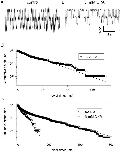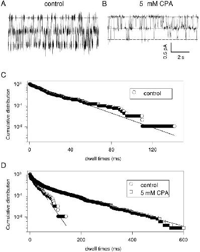 Figure 7. . Kinetic analysis of a single channel at −100 mV. The long recordings shown in A (control) and B (with 5 mM CPA in the bath solution) were subjected to idealization after filtering at 500 Hz as described in materials and methods. In C is shown the dwell time distribution of the closed state in control conditions. In D are shown in the same graph the dwell time distribution of the closed state in control conditions (circles) (same data as in C; note, however, the different time scale) and in presence of 5 mM CPA (squares). In the absence of CPA dwell times could be well fitted with single exponential function with τ0 = 13.6 ms (dashed line). In the presence of CPA, the distribution of zero current epochs (empty squares) was fitted with the sum of three exponential functions (solid line) with time constants: τ01 = 132.9 ms, τ02 = 30.3 ms, and τ03 = 3.0 ms. The idealization was performed not accepting transitions lasting <1 ms.
