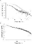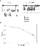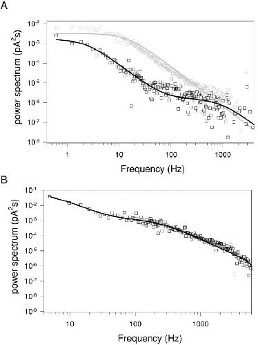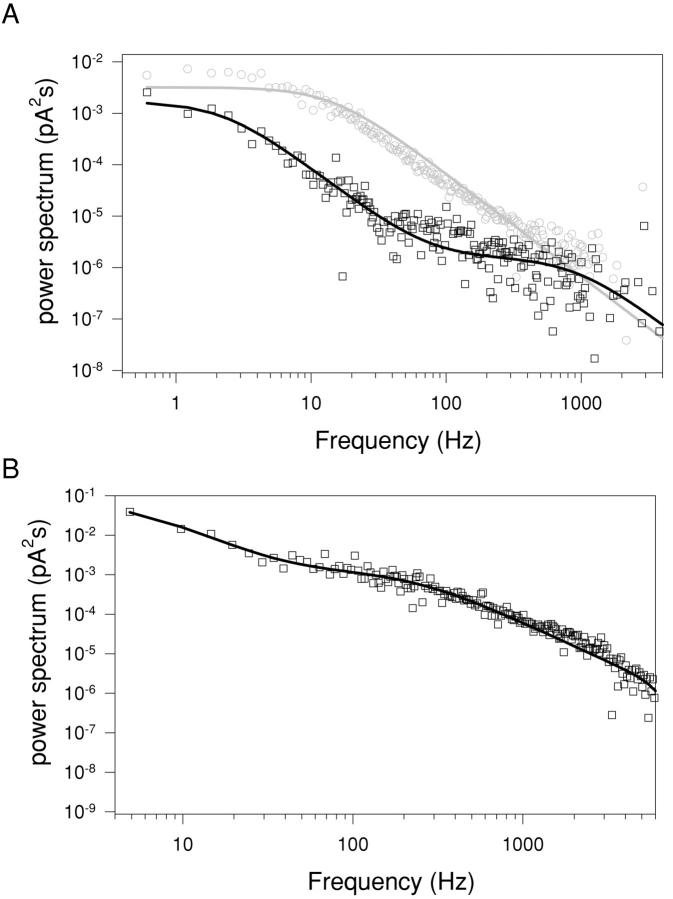 Figure 8. . Power spectra of a single channel and of macroscopic currents. (A) Power spectrum analysis of a single channel at −80 mV in control conditions (gray circles) and in presence of 20 mM CPA (black squares). The control spectrum is well fitted with a single Lorentzian function with a corner frequency of 14 Hz (solid gray line). The sum of two Lorentzians (see materials and methods) with corner frequencies of 2.3 and 920 Hz was needed to fit the spectrum in presence of 20 mM CPA. Baseline spectrum was subtracted from both spectra. The spectra were calculated as described in materials and methods. (B) A representative spectrum of macroscopic currents measured with 20 mM CPA at −140 mV (circles) fitted with the sum of two Lorentzian functions (see materials and methods) with corner frequencies of 5.1 Hz and 231 Hz, respectively. Spectra of macroscopic currents in the absence of CPA presented a major component at 14 Hz and a small component above 2 kHz (unpublished data).