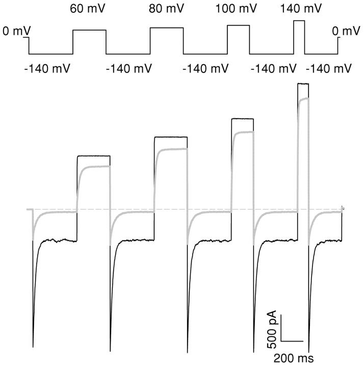 Figure 2. . Open channel block of CPA at positive voltages. Currents recorded with the protocol shown in the top panel in the absence (black line) and in the presence of 20 mM intracellular CPA (gray line). Note the significant inhibition even at +140 mV.