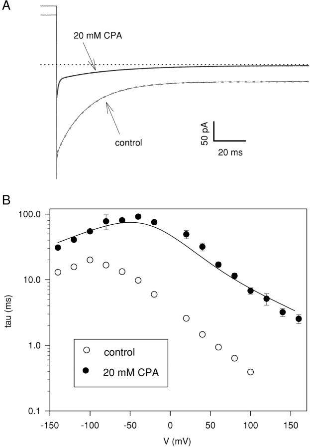 Figure 4. . Voltage dependence of the slow time constant measured at 20 mM CPA. (A) Currents recorded immediately after a voltage step to −140 mV from the holding potential of 0 mV without and with 20 mM CPA (see arrows). In control the time course of the deactivating currents is well described with a single exponential function (τ(control) = 19.5 ms, dashed gray line). In the presence of 20 mM CPA the deactivation is described with the sum of two exponentials (thick solid gray line): a very fast one with a time constant <1 ms and a second one whose time constant is slightly slower that recorded in control condition (τf(CPA 20 mM) = 0.9 ms and τs(CPA 20 mM) = 35 ms). The capacitive transients were not subtracted. (B) The slow time constants were measured with protocols similar to those described in Fig. 1. Open circles: control; filled circles: 20 mM CPA. The solid line represents the predictions of Model 1 if the simulated relaxations are fitted with a single exponential function (see materials and methods), considering only the slow relaxations and ignoring the faster relaxation.