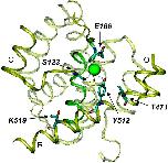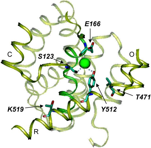 Figure 10. . Location of mutated residues. The residues of StCLC that correspond to the ones mutated here (correspondence according to the alignment of (Dutzler et al., 2002): S123(CLC-0) → S107(StCLC); E166(CLC-0)->E148(StCLC); T471(CLC-0) → V402(StCLC); Y512(CLC-0) → Y445(StCLC); K519(CLC-0) → T452 (StCLC)) and the highly conserved Glut148 are highlighted in a view of part of the structure of StCLC (Dutzler et al., 2002). Several helices and loops are shown as cartoon. The green sphere corresponds to the Cl− ion seen in the crystal structure. The figure was prepared with the program VMD (Humphrey et al., 1996).