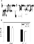 Figure 9. . Effect of [Cl−]ext on the open channel KD at negative voltages. (A) Open channel block with 5 mM [Cl−]ext. Stretches of a single-channel recording without (left) and with 5 mM CPA in the intracellular solution (right) at −80 mV are shown. The dotted line represents the zero current level, the dashed line the current level associated to one pore open. (B) Comparison of the open channel KD in high (black bars) and low (gray bars) [Cl−]ext at −80 and −100 mV. Errors bars are SEM.