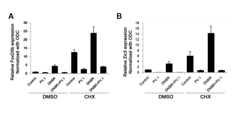 Fig. 2. PV.1 reduces FoxD5b and Zic3 expression. (A, B) Embryos were injected with RNAs (PV.1, 500 pg and DNBR, 1 ng) at the one-cell stage as indicated. Animal explants were dissected at stage 8 and incubated in the animal cap media containing DMSO or cyclohexamide (CHX, 5 ng/ml) until stage 10. RT-PCR was performed to analyze the relative FoxD5a and Zic3 expressions. Data are shown as the means ± the S.D. of the values from at least 3 independent experiments. Differences were considered significant at P < 0.05.
