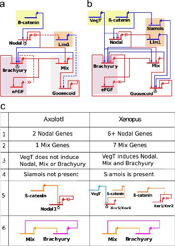 Fig. 1. A comparison of the axolotl and Xenopus mesendoderm GRNs. (a) The axolotl mesendodermGRN and (b) the simplified Xenopus mesendodermGRN. Arrow and bar heads represent, respectively, activation and repression. The âAâ indicates that an input is, in Boolean terms, an âANDâ gate. The âSâ indicates a synergy between the two transcription factors, i.e. β-catenin activates Nodal1 and this activation is enhanced by Nodal autoregulation. Otherwise, multiple inputs consisting of only one type (repression or activation) correspond to an âORâ gate. When both types are present, the repression and activation inputs are treated as two âORâ gates coupled by an âANDâ gate. Red lines show interactions which are the same in both networks and blue lines show those which differ. In (b) solid lines indicate experimentally verified links and dashed lines indicate links which are inferred from the Xenopus mesendoderm network, and which need to be verified experimentally. (c) Table summarising the main differences between the axolotl and Xenopus mesendoderm GRNs. Row 1: At least 6 Nodal genes are found in Xenopus, compared with 2 Nodal genes in axolotl. Row 2: There are seven Mix genes in Xenopus and one Mix gene in axolotl. Row 3: VegT acts to activate expression of Nodal, Mix and Brachyury in Xenopus, but in axolotl VegT does not activate these genes. Row 4: Siamois is a gene found in Xenopus but not axolotl. Row 5: In Xenopus, β-catenin acts in two different ways on Nodal: β-catenin enhances Nodal autoregulation of Xnr1 and Xnr2, and the expression of Xnr5 and Xnr6 is activated by β-catenin in the presence of VegT. In axolotl, Nodal1 can be activated by β-catenin alone and we also assume that it can enhance Nodal autoregulation. Row 6: Mix and Brachyury mutually repress each other in Xenopus, but, in axolotl, Mix is required for the expression of Brachyury. (For interpretation of the references to colour in this figure caption, the reader is referred to the web version of this paper.)