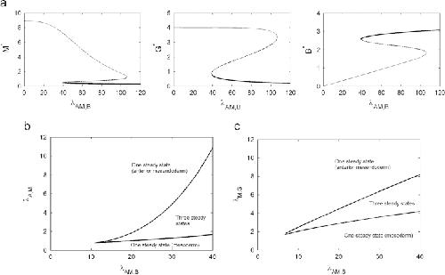Fig. 4. (a) Steady state solutions to (7) plotted against λAM,B for A=5. Thick solid lines represent the mesoderm steady state, thin solid lines represent the anterior mesendoderm steady state and dashed lines represent the unstable steady state. Fold bifurcations mark the appearance and the disappearance of the steady states. (b) Solution structure in terms of the bifurcation parameters λAM,B and λA,M, these representing the folds that determine the maximum rates of production of Brachyury and Mix in response to activation by Activin. (c) Solution structure in terms of the bifurcation parameters λAM,B and λM,G, these representing the folds that determine the maximum rates of production of Brachyury in response to activation by Activin and Goosecoid in response to Mix. Unless otherwise stated, parameters were chosen as in Table 2.