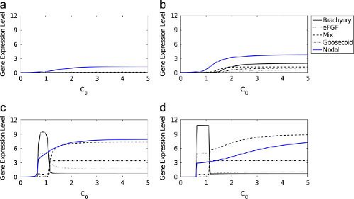 Fig. 9. Numerical solutions of the axolotl model as functions of C0, for various values of Ï. The response of Brachyury (thin solid line), eFGF (dotted line), Mix (dashed line), Goosecoid (dot-dashed line) and Nodal (blue solid line) are shown in response to an initial concentration of β-catenin. Parameters were chosen as in Table 3. (a) T=0.5, (b) T=1, (c) T=8 and (d) T=100. (For interpretation of the references to colour in this figure caption, the reader is referred to the web version of this paper.)