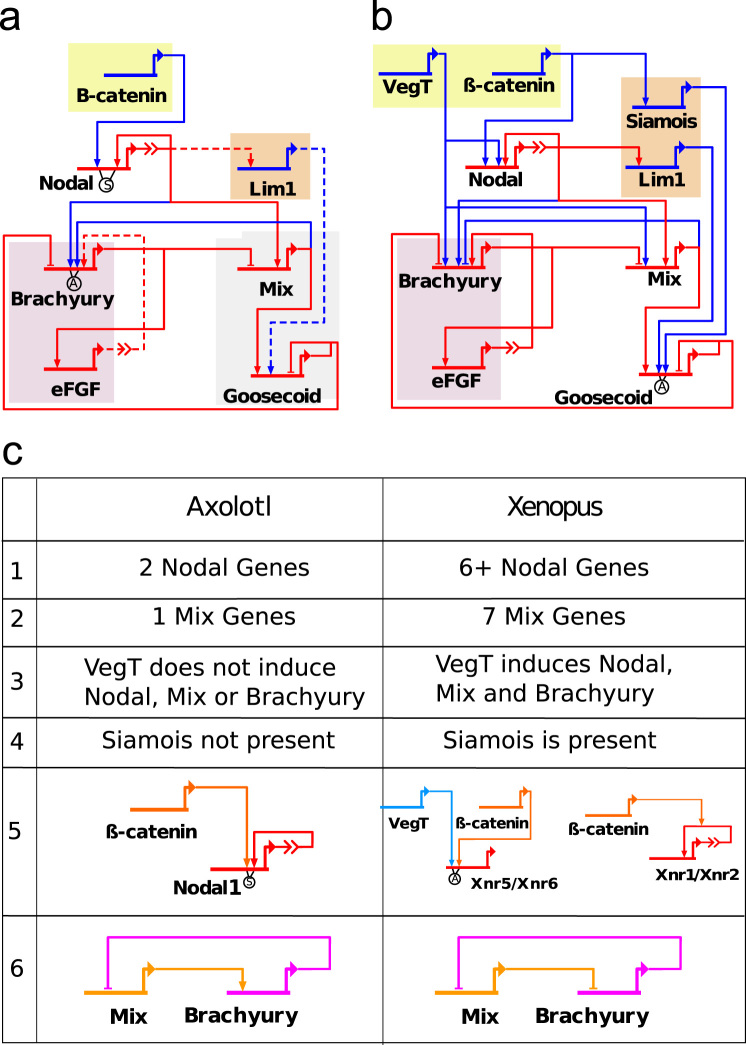 Fig. 1. A comparison of the axolotl and Xenopus mesendoderm GRNs. (a) The axolotl mesendodermGRN and (b) the simplified Xenopus mesendodermGRN. Arrow and bar heads represent, respectively, activation and repression. The âAâ indicates that an input is, in Boolean terms, an âANDâ gate. The âSâ indicates a synergy between the two transcription factors, i.e. β-catenin activates Nodal1 and this activation is enhanced by Nodal autoregulation. Otherwise, multiple inputs consisting of only one type (repression or activation) correspond to an âORâ gate. When both types are present, the repression and activation inputs are treated as two âORâ gates coupled by an âANDâ gate. Red lines show interactions which are the same in both networks and blue lines show those which differ. In (b) solid lines indicate experimentally verified links and dashed lines indicate links which are inferred from the Xenopus mesendoderm network, and which need to be verified experimentally. (c) Table summarising the main differences between the axolotl and Xenopus mesendoderm GRNs. Row 1: At least 6 Nodal genes are found in Xenopus, compared with 2 Nodal genes in axolotl. Row 2: There are seven Mix genes in Xenopus and one Mix gene in axolotl. Row 3: VegT acts to activate expression of Nodal, Mix and Brachyury in Xenopus, but in axolotl VegT does not activate these genes. Row 4: Siamois is a gene found in Xenopus but not axolotl. Row 5: In Xenopus, β-catenin acts in two different ways on Nodal: β-catenin enhances Nodal autoregulation of Xnr1 and Xnr2, and the expression of Xnr5 and Xnr6 is activated by β-catenin in the presence of VegT. In axolotl, Nodal1 can be activated by β-catenin alone and we also assume that it can enhance Nodal autoregulation. Row 6: Mix and Brachyury mutually repress each other in Xenopus, but, in axolotl, Mix is required for the expression of Brachyury. (For interpretation of the references to colour in this figure caption, the reader is referred to the web version of this paper.)