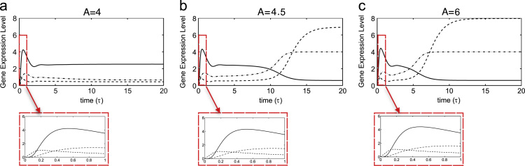 Fig. 6. Numerical solutions of the axolotl in vitro model as functions of A for (a) A=4, (b) A=4.5, (c) A=6. The responses of Brachyury (thin solid line), Mix (dashed line) and Goosecoid (dot-dashed line) are shown. Parameters were chosen as in Table 2.