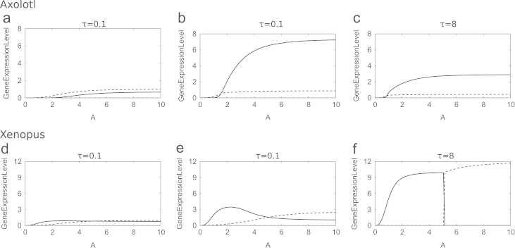 Fig. 7. Numerical solutions of the Xenopus in vitro model (Middleton et al., 2009) and the axolotl in vitro model (7), in the absence of Goosecoid, as functions of A. The responses of Brachyury (thin solid line), Mix (dashed line) and Goosecoid (dot-dashed line) are shown. Parameters used are given in Table 2 for the axolotl model and as given in Middleton et al. (2009) for the Xenopus. Values of λM,G, θG,G and λXM,B are higher in the axolotl model than in the Xenopus model, corresponding to higher rates of production of Mix and Brachyury and a higher threshold for Goosecoid negative autoregulation.