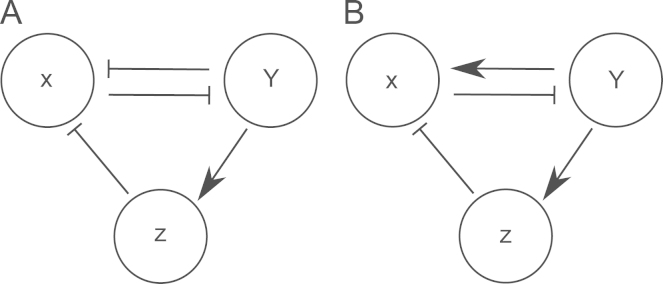 Fig. 10. Gene regulatory networks which yield bistability. (A) Mutual negative regulation between X and Y drives differentiation of a cell to express either X or Y, with the indirect repression of X by Y (via Z) being dispensible. (B) An alternative network, where the indirect repression of X by Y (via Z) is necessary to drive differentiation of a cell to express Y.