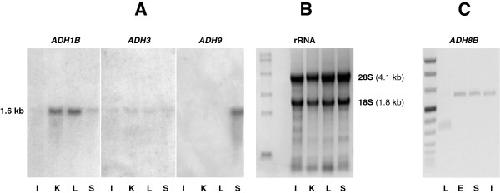 Figure 1. Detection of ADH classes in X. laevis. (A) Northern blot analysis of ADH1B, ADH3 and ADH9 from intestine (I), kidney (K), liver (L) and stomach (S), performed on 15-μg samples of total RNA. (B) Ethidium bromide-stained gel, from the same electrophoresis as in panel (A), showing 18S and 28S rRNAs next to the RNA molecular weight marker (0.24-9.5 kb, Invitrogen). The estimated molecular size of the RNA hybrids detected was ~1.6 kb. (C) RT-PCR of ADH8B from liver (L), esophagus (E), stomach (S) and intestine (I) next to DNA molecular weight marker VIII (Roche). Esophagus, stomach and intestine show an amplification product of 603 bp, indicating the presence of the ADH8B cDNA.