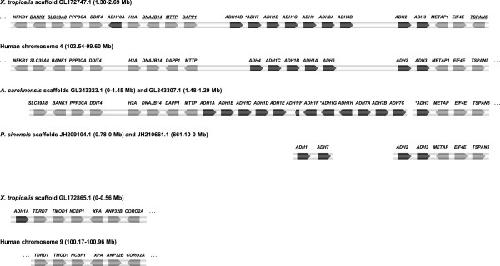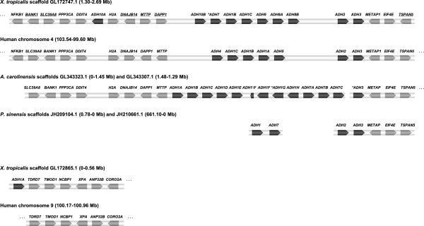 Figure 3. Chromosomal location and synteny of ADH loci.X. tropicalis scaffolds GL172747.1 and GL172865.1 are compared to human syntenic chromosomes 4 and 9, A. carolinensis scaffolds GL343323.1 and GL343307.1, and P. sinensis JH210661.1 and JH209104.1. All the identified genes are shown transcriptionally oriented (ADH genes in black and others in grey). The genes marked with an asterisk lack the first exon in the assembly. The opposite orientation of several orthologous genes (underlined) in X. tropicalis and human suggests a past inversion and posterior rearrangements involving the ADH cluster. In contrast, frog genes between NPNT (nephronectin, not shown) and NFKB1, located at 0.58-1.30Â Mb of scaffold GL172747.1, have the same orientation as their human orthologues (not shown). Gene symbols in human chromosomes are NFKB1: Nuclear factor of kappa light polypeptide gene enhancer in B cells 1, SLC39A8: Solute carrier family 39 (zinc transporter) member 8, BANK1: B-cell scaffold protein with ankyrin repeats 1, PPP3CA: Serine/threonine phosphatase 2B catalytic subunit (alpha isoform), DDIT4L: DNA-damage inducible transcript 4-like, H2AFZ: Histone H2A family member Z, DNAJB14: DnaJ homolog subfamily B member 14, MTTP: Microsomal triglyceride transfer protein, DAPP1: Dual adaptor for phosphotyrosine and 3â²-phosphoinositides, METAP1: Methionine aminopeptidase 1, EIF4E: Eukaryotic translation initiation factor 4E, TSPAN5: Tetraspanin 5, TDRD7: Tudor domain containing protein 7, TMOD1: Tropomodulin-1, NCBP1: 80Â kDa nuclear cap binding protein, XPA: DNA-repair protein complementing XP-A cells, ANP32B: Acidic leucine-rich nuclear phosphoprotein 32 family member B, CORO2A: Coronin-2A.