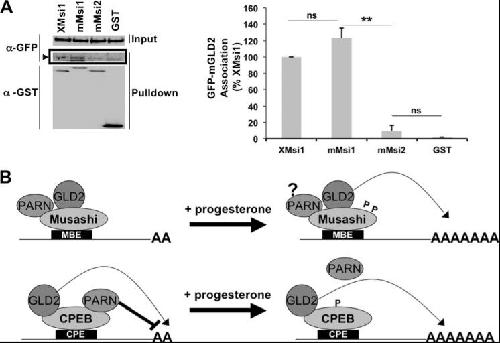 Figure 6. Conservation of GLD2 and Musashi-1 co-association. A, oocytes were injected with GFP-tagged murine GLD2 (mGLD2) and GST-tagged Xenopus Musashi-1 (XMsi1), murine Musashi-1 (mMsi1), Musashi-2 (mMsi2), or the GST moiety alone. Co-associated proteins were assessed by Western blotting with GFP. A GFP-mGLD2-specific band was detected in both Xenopus and mouse GST-Musashi-1 pulldowns (arrowhead) but not with GST-mMusashi-2 or GST alone. A representative experiment is shown, as well as the average of three independent experiments (graph, right panel). **, indicates p < 0.01. ns, not significant. B, proposed model of Musashi regulation of polyadenylation of target mRNAs (upper panel). Our data indicate GLD2 mediates polyadenylation of Musashi target mRNAs following progesterone addition. The role and regulation of PARN within the Musashi complex are unclear (?) at the juncture. The cytoplasmic polyadenylation element-binding protein model, showing progesterone-dependent PARN expulsion, is shown for comparison (lower panel). |