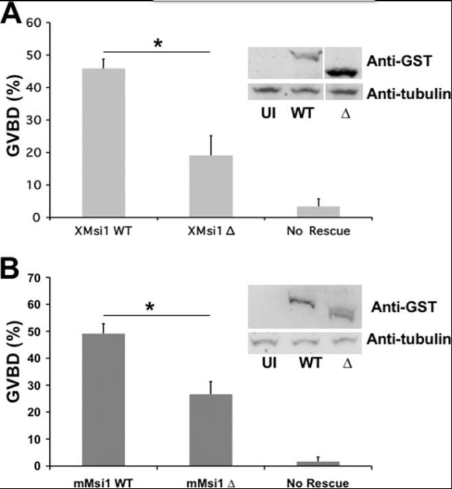 Figure 3. Deletion of the GLD2 binding domain in Musashi-1 compromises Musashi-mediated oocyte maturation. A, oocytes were injected with antisense oligonucleotides targeting endogenous Musashi-1 and Musashi-2. Following incubation, the oocytes were left untreated or re-injected with mRNA encoding wild-type (WT) or deletion mutant Δ190–272 of Xenopus Musashi-1 and allowed to express the protein prior to being stimulated to mature with progesterone. The Δ190–272 Musashi mutant protein is significantly compromised for rescue. The data represent three experiments. The Western panel inset demonstrates expression of the introduced Musashi rescue proteins. UI, uninjected, no rescue protein. * indicates p < 0.05. B, oocytes were injected with antisense oligonucleotides as described in A and subsequently re-injected with WT or Δ190–234 mutant mouse Musashi-1. The deletion mutant protein is significantly compromised for rescue of GVBD. * indicates p < 0.05. |