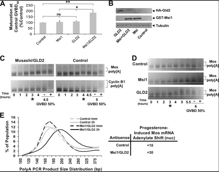 Figure 5. GLD2 is sufficient of promote Musashi-mediated polyadenylation and oocyte maturation. A, oocytes were injected with nuclease-free water (control) or mRNA mixtures containing GST-Musashi-1, HA-GLD2a, or GST-Musashi-1 and HA-GLD2a. The oocytes were allowed to express the injected RNA and were then stimulated to mature with progesterone. The maturation rate relative to control in five independent experiments is shown graphically. *, indicates p < 0.05; **, indicates p < 0.01. ns, not significant. B, representative Western blot showing protein expression from an experiment in A. C, representative poly(A) assay comparing polyadenylation of two endogenous mRNAs from Musashi/GLD2 co-injected oocytes relative to water-injected (control) oocytes. The Mos mRNA is under Musashi control and therefore polyadenylated early (prior to GVBD), whereas the cyclin B1 mRNA is under cytoplasmic polyadenylation element-binding protein control and polyadenylated late (at or after GVBD). The earliest signs of polyadenylation (*) appear at 3 h for all 3 conditions. − indicates pre-GVBD; + indicates post-GVBD samples. D, poly(A) length assay comparing polyadenylation of Mos mRNA from Musashi, GLD2, or water-injected (control) oocytes. The earliest signs of polyadenylation appear at 3 h for all three conditions. This indicates that the acceleration in onset of polyadenylation seen in C requires overexpression of both Musashi-1 and GLD2 together. − indicates pre-GVBD; + indicates post-GVBD. E, graphic representation of the poly(A) assay (C) for the Mos mRNA at the 3rd h. The dashed line is immature (Imm) oocytes (0 h), and the solid line is at the 3-h time point. Gray lines represent water (control) injection, and the black lines are Musashi/GLD2 co-injected oocytes. At the 3rd h, Musashi/GLD2 co-injection has promoted a polyadenylation of ∼30 adenylate residues, whereas control injected oocytes have only extended their poly(A) tails by ∼10 adenylates. |