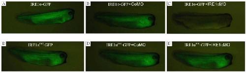 Fig. 3. Inhibition of in vivo translation of a xIRE1α/GFP fusion construct by IRE1α-MO. xIRE1α/GFP RNA or xIRE1αmut/GFP RNA was injected into 4 blastomeres at 4-cell stage alone (A, D), or co-injected with 50 ng control MO (B, E) or 50 ng IRE1α MO (C, F). Embryos were collected at stage 31 and GFP was monitored.
