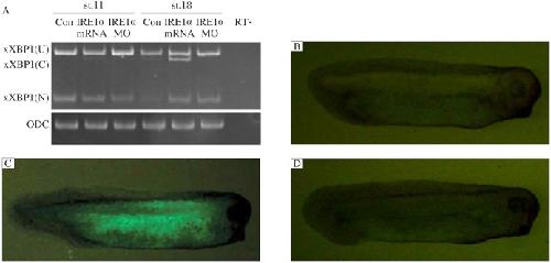 Fig. 6. Effects of xIRE1α on cytoplasmic splicing of xXBP1.RT-PCR (A) detected an increase of cytoplasmic variant xXBP1 (C) in embryos injected with xIRE1α mRNA and a decrease of the xXBP1(C) in embryos injected with IRE1αMO at stage 11 and 18. ODC (ornithine decarboxylase) served as a loading control. Monitoring the xXBP1 splicing by xIRE1α in vivo (B-D). Embryos injected with 500 pg xXBP1(U)-EosFP RNA individually or in combination with 1 ng xIRE1α RNA and/or 50 ng XBP (C) MO. xXBP1 (U), unspliced xXBP1; xXBP1(N), nuclear spliced xXBP1. RT-: no-reverse transcriptase control.