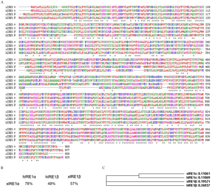 Fig. 1. Xenopus IRE1α sequence analysis.A: Alignment of Xenopus xIRE1α, xIRE1β, hIRE1α and hIRE1β animo acid sequences. Identical residues are marked by asterisks. Gaps are introduced to achieve optimum alignment. B: Percentage of identity between IRE1 proteins. C: Phylogenetic tree of IRE1 proteins of different species created by ClustalW (h, Homo sapiens; x, Xenopus laevis).