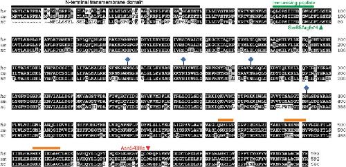 Figure 1. Alignment of the Xenopus heparanase 2 protein sequence with human and mouse orthologues. Xenopus heparanase 2 shares 80% identity (black highlight) and 88% similarity (black plus grey highlight) with human heparanase 2. The majority of non-conserved amino acids are in the N-terminal region (black bar), predicted to constitute a signal peptide. Putative HS-binding motifs are indicated by orange bars. Glycosylated amino acids are indicated by blue diamonds. Asn543, which undergoes a missense mutation in UFS (10), is conserved between species. The immunizing peptide used to generate the heparanase 2 antibody used in this study is indicated in green as is the nonsense mutation created by injection of the splice acceptor morpholino (MO1). |