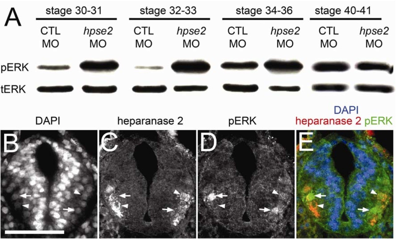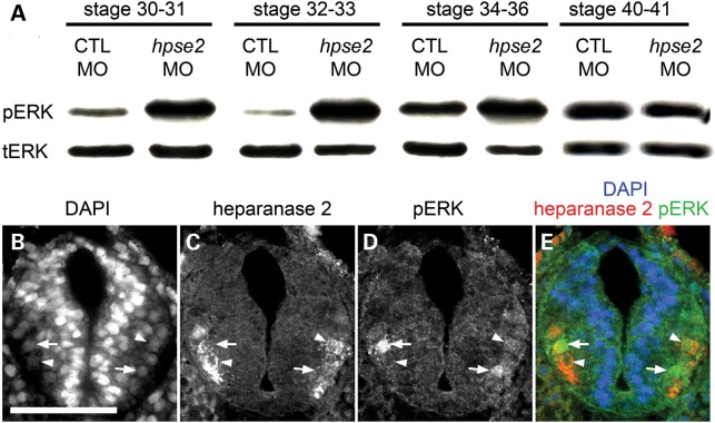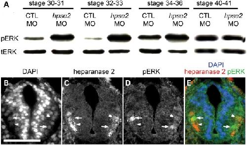Figure 7. pERK detected by western blotting and IHC. (A) Western blots for pERK and tERK in sets of pooled embryos collected, as indicated, between Stages 30 and 41. Note that the signal for pERK was clearly increased in heparanase 2 knock-down embryos versus CTL MO embryos between Stages 30 and 36. This effect was no longer apparent at Stages 40 and 41 (BâE) Transverse section of the neural tube of Stage 32 uninjected embryo, with the dorsal surface uppermost, showing (B) all nuclei stained with diamindino-2-phenylindole (DAPI), (C) heparanase 2 immunoreactivity, (D) pERK immunoreactivity, and (E) merged image. pERK+ nuclei (two are indicated by arrows) and heparanase 2+ cells (two are indicated by arrowheads) are detected in the lateral zones of the tube. Note that the cells with strong nuclear pERK immunostaining and those with strong heparanase 2 signals tend to be mutually exclusive. The image is representative of experiments on three embryos. |