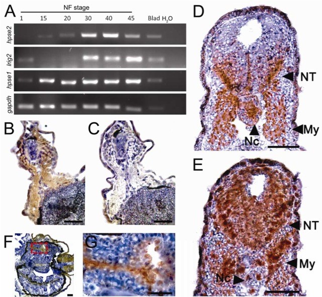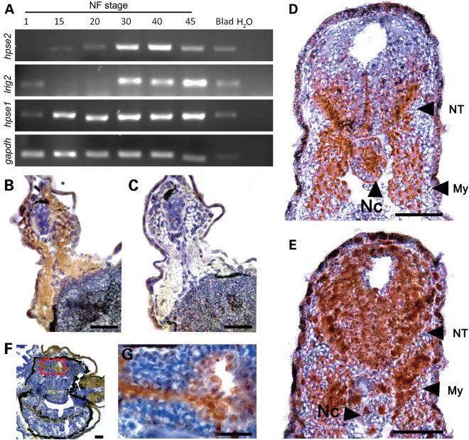 Figure 2. Expression of UFS genes and immunolocalisation of UFS proteins. (A) RT- PCR analysis of a developmental stage series derived from whole embryo RNA. hpse2 was absent at Nieuwkoop-Faber (NF) stage 1 but was detected from stage 15 to stage 45. lrig2 was expressed at stage 1, then weakly at stages 15/20, after which transcript levels became prominent. hpse1 was detected at all stages analysed. All three transcripts were present in adult urinary bladder (Blad). gapdh was included as a cDNA loading control. In the H2O column, no cDNA was used. (B) Transverse section through the trunk of a stage 40 embryo, with the dorsal surface uppermost. Brown colour shows positive IHC signal for heparanase 2, most prominent in the myotomes flanking the central neural tube, and fainter expression in the ventrolateral neural tube. (C) Adjacent section to (B), with the same orientation, showing minimal IHC signal after preincubating primary antibody with the immunising peptide. (D) Transverse section through the trunk at stage 30, with the dorsal surface uppermost. Prominent heparanase 2 immunoreactivity in detected in the ventrolateral regions of the neural tube (NT), in the notochord (Nc) and in the flanking skeletal muscle myotomes (My). (E) Adjacent section to (D), with the same orientation, immunostained for LRIG2. A similar pattern to that of heparanase 2 is observed, extending into the dorsal half of the neural tube. (F) Transverse section from a stage 42 embryo, with the left side uppermost. Three sections of gut are apparent, the archenteron having undergone coiling. Heparanase 2 immunoreactivity is observed in the luminal surface of the gut epithelium, and shown in closer detail in (G). B-G were counterstained with haematoxylin, rendering nuclei blue. Scale bars are 50 μm. |