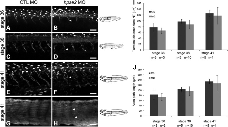 Figure 5. Visualization of motor neurons in parasagittal imaging plane. (A)â(F) whole-mounts immunostained with antibody to acetylated α-tubulin. This labels axons and also multiciliated round organs in the skin, the latter appearing as white ovals. (G) and (H) were probed with the muscle antibody 12/101. (A), (C), (E) and (G) are from CTL MO-administered embryos while (B), (D), (F) and (H) are from MO1-administered embryos. Scale bars are 50 μm. (AâF) Across the top of each frame, a longitudinal section of the neural tube is evident, with the anterior to the left. In morphants, at Stages 36, 38 and 41, neurons which had emanated from the neural tube were regularly spaced but their axons lacked compact bundling and coherent directional extension seen in controls. The irregular topography of certain morphant nerves is indicated by arrowheads in (B), (D) and (F). (G and H) Morphants showed lack of clear separation of skeletal muscle blocks at somitic boundaries (arrowheads in H). (I and J) Nerve lengths (means ± SD), as assessed by determining the shortest distance between where they exited the neural tube and their overt termini (I) or by tracing individual nerves (J). The average length of 4â6 nerves per embryo was used to generate a value for each embryo, with 3â10 embryos in each experimental group, as indicated. |