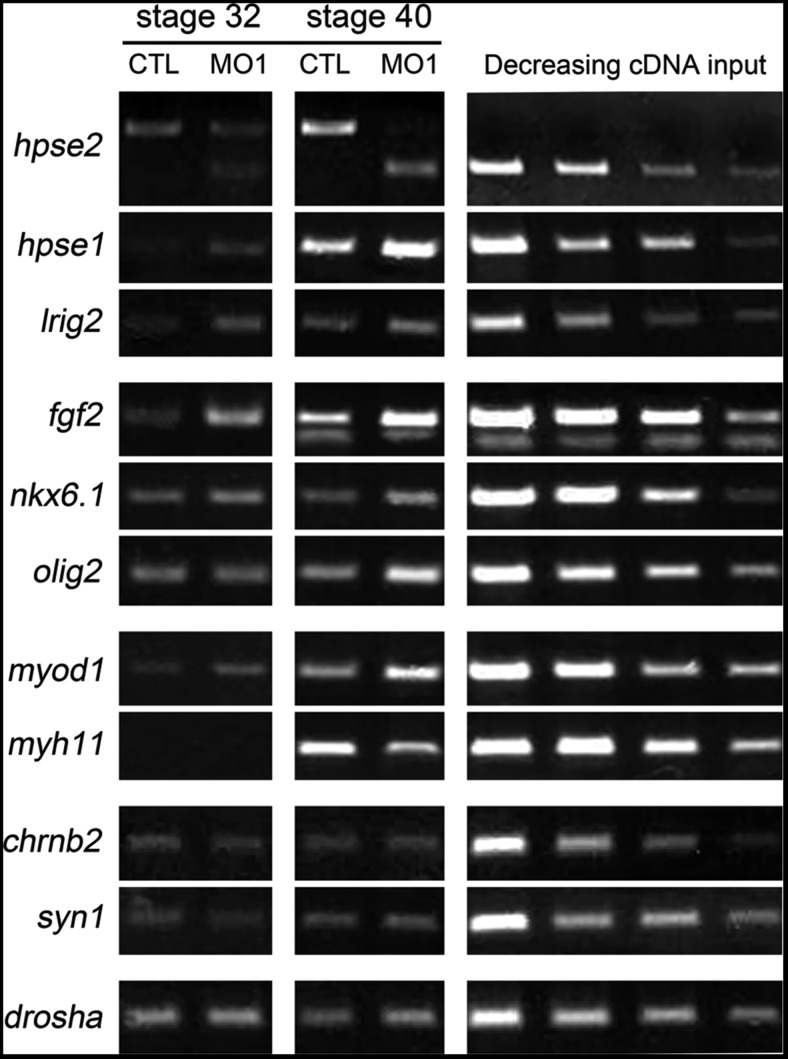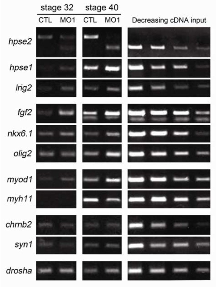 Figure 6. Expression analyses in heparanase 2 knockdown embryos. RNA from pools of stage 32 and 40 control (CTL MO) and morphant (hpse2 MO1) embryos was subjected to RT-PCR, with serial dilutions of cDNA depicted on the right of each row. drosha, which encodes an RNase III enzyme, was used as a housekeeping control. Morphants had: downregulated wild type hpse2 exon 2 and the appearance of the shorter exon 2δ amplicon; increased levels of hpse1 and lrig2; increased levels of fgf2 and of the neuronal precursor markers olig2 (at stage 40) and nkx6.1; upregulated myod1, encoding a skeletal muscle transcription factor, and downregulated myh11, encoding a smooth muscle myosin (at stage 40). Levels of syn1 and chrnb2, encoding synaptic molecules, were similar in morphants and controls. |