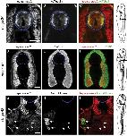 Figure 3. Tissue-specific localization of heparanase 2. Transverse sections through the trunk of Xenopus embryos, as indicated in the diagrams shown on the right, imaged by immunofluorescence, with the neural tube outlined by blue dashed circles. In merged images, heparanase 2 localization is indicated in red while other proteins are indicated in green. (AâC) Heparanase 2 colocalized with acetylated α-tubulin (AcTubulin) in the lateral zones of the Stage 30 neural tube. The flanking myotomes were also positive for heparanase 2. (DâF) At Stage 42, heparanase 2 was absent in the neural tube but myotomes, co-immunostained with the muscle-marker antibody 12/101 (it is the name of an antibody), remained positive. (GâI) The Stage 42 pronephric tubule did not display a specific IHC signal for heparanase 2; note that here, the weak signal is background autofluorescence. The two arrows indicate a proximal tubule which in H and I is seen to be reactive with Na+/K+-ATPase antibody. The set of three arrowheads in (G)â(I) demonstrate specific heparanase 2 immunostaining in the apical zone of epithelia lining the gut lumen. Scale bars are 50 µm. |