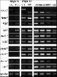 Figure 6. Expression analyses in heparanase 2 knock-down embryos. RNA from pools of Stages 32 and 40 control (CTL MO) and morphant (hpse2 MO1) embryos was subjected to RT-PCR, with serial dilutions of cDNA depicted on the right of each row. drosha, which encodes an RNase III enzyme, was used as a housekeeping control. Morphants had: downregulated wt hpse2 exon 2 and the appearance of the shorter exon 2Πamplicon; increased levels of hpse1 and lrig2; increased levels of fgf2 and of the neuronal precursor markers olig2 (at Stage 40) and nkx6.1; upregulated myod1, encoding a skeletal muscle transcription factor, and downregulated myh11, encoding a smooth muscle myosin (at Stage 40). Levels of syn1 and chrnb2, encoding synaptic molecules, were similar in morphants and controls. |