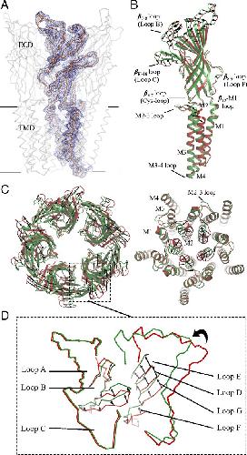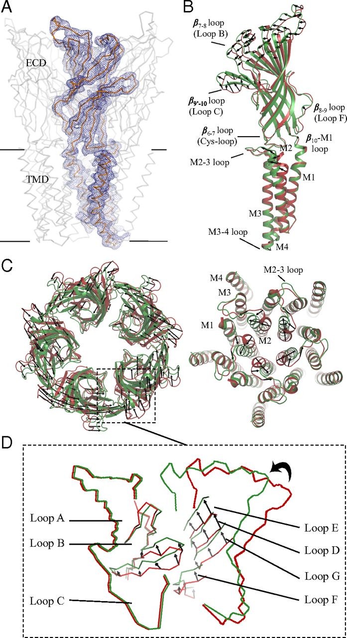 Fig. 1. Superimposition of the pH 4 and pH 7 GLIC structures. (A) The Cα trace of a full-length monomer of GLIC is represented in gray. The blue mesh is the 2mFo–DFc NCS-averaged electron density map contoured at a level of 1.5 σ. (B) Side view of a full-length monomer; superimposition of the open pH 4 (green) and closed pH 7 (red) GLIC structures; the black arrows show the direction of the motion observed from the closed form to the open form. (C) Upper view of ECDs. (D) Upper view of TMDs. (E) Enlarged view of the orthosteric agonist binding site at the interface.
